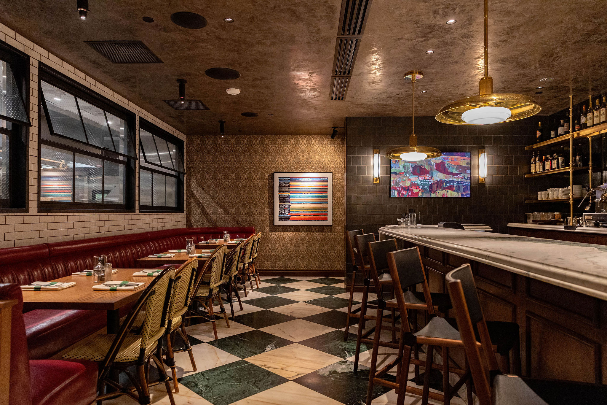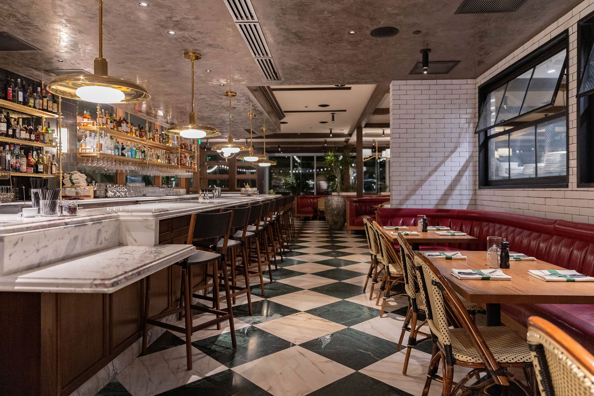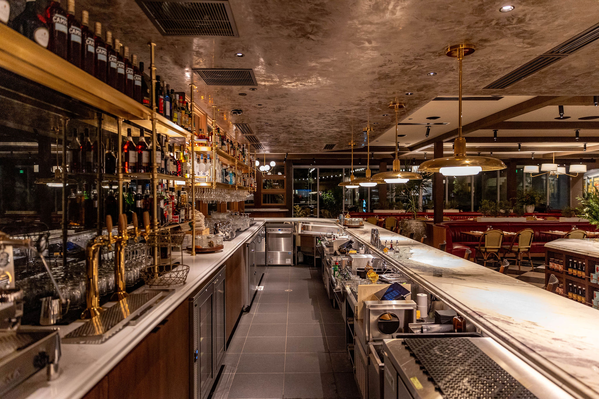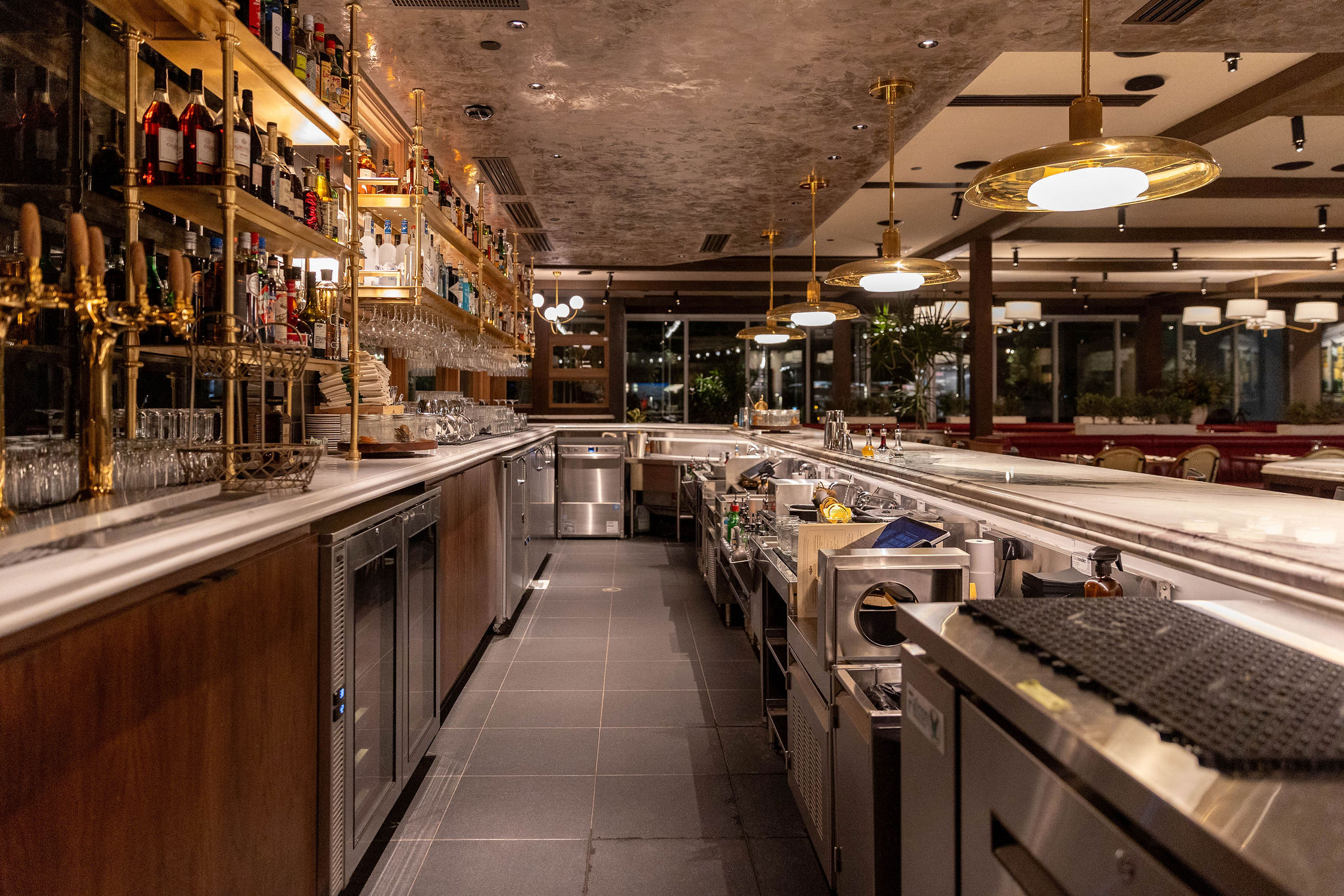 Dual Custom Bars as Design Anchors: The restaurant features two full-service bars, each highlighted by custom brass shelving and bespoke detailing. These bars serve as focal points within the space, combining durability with a refined, high-end presentation that supports high-volume service.