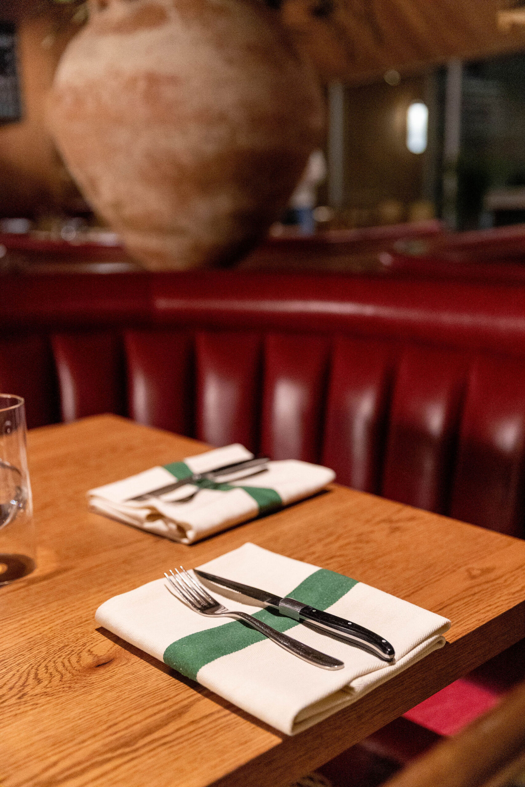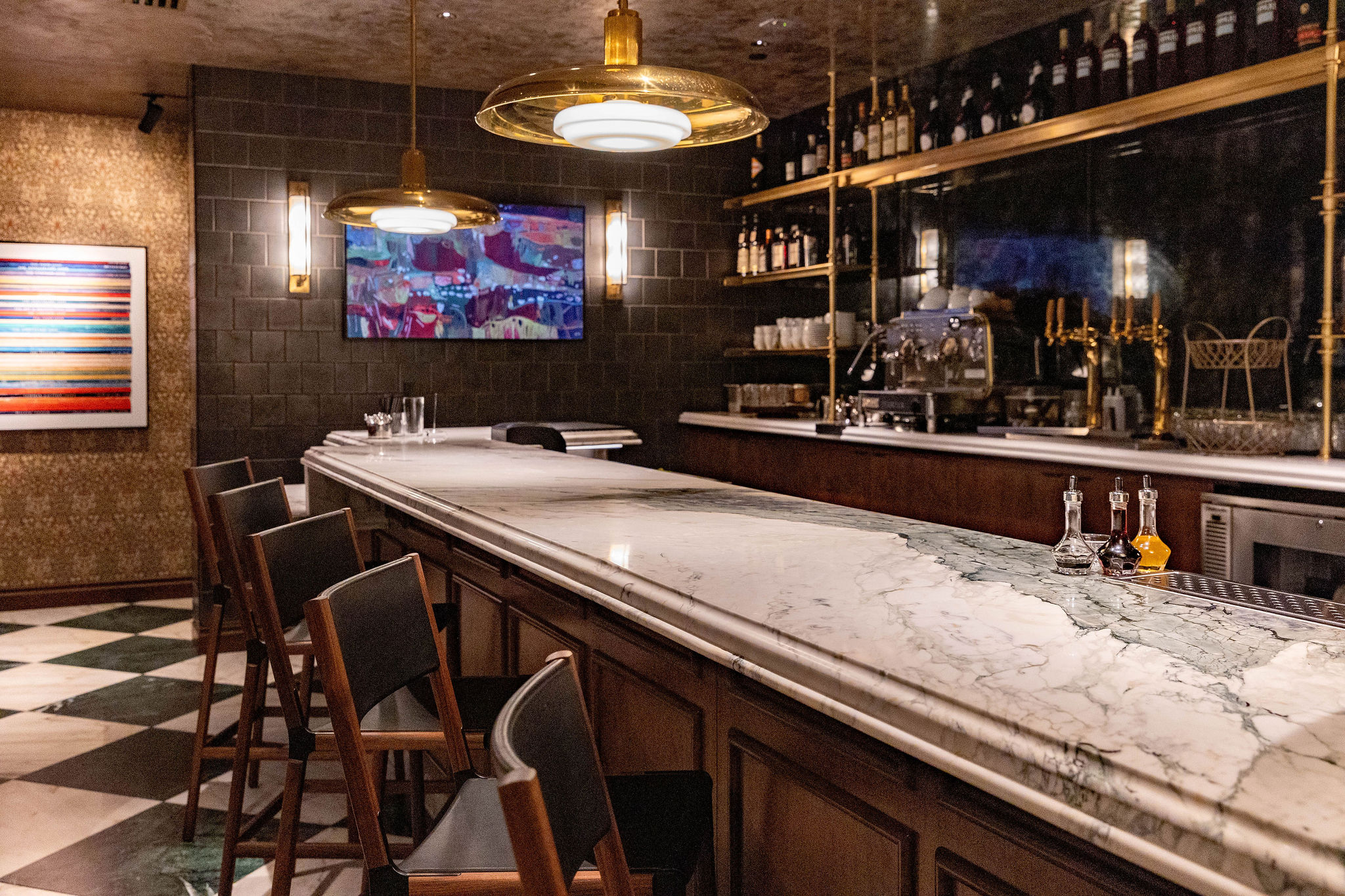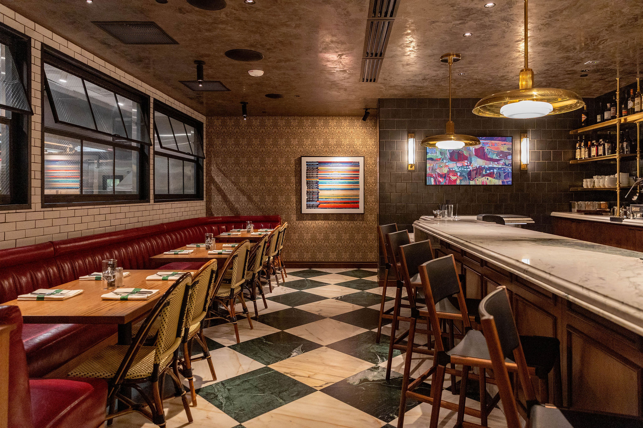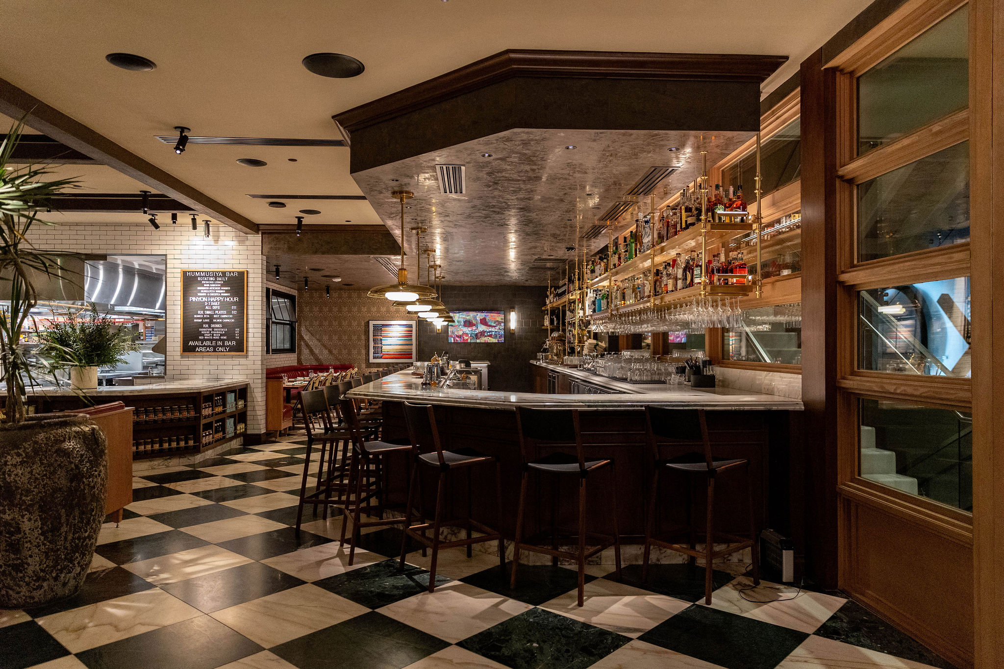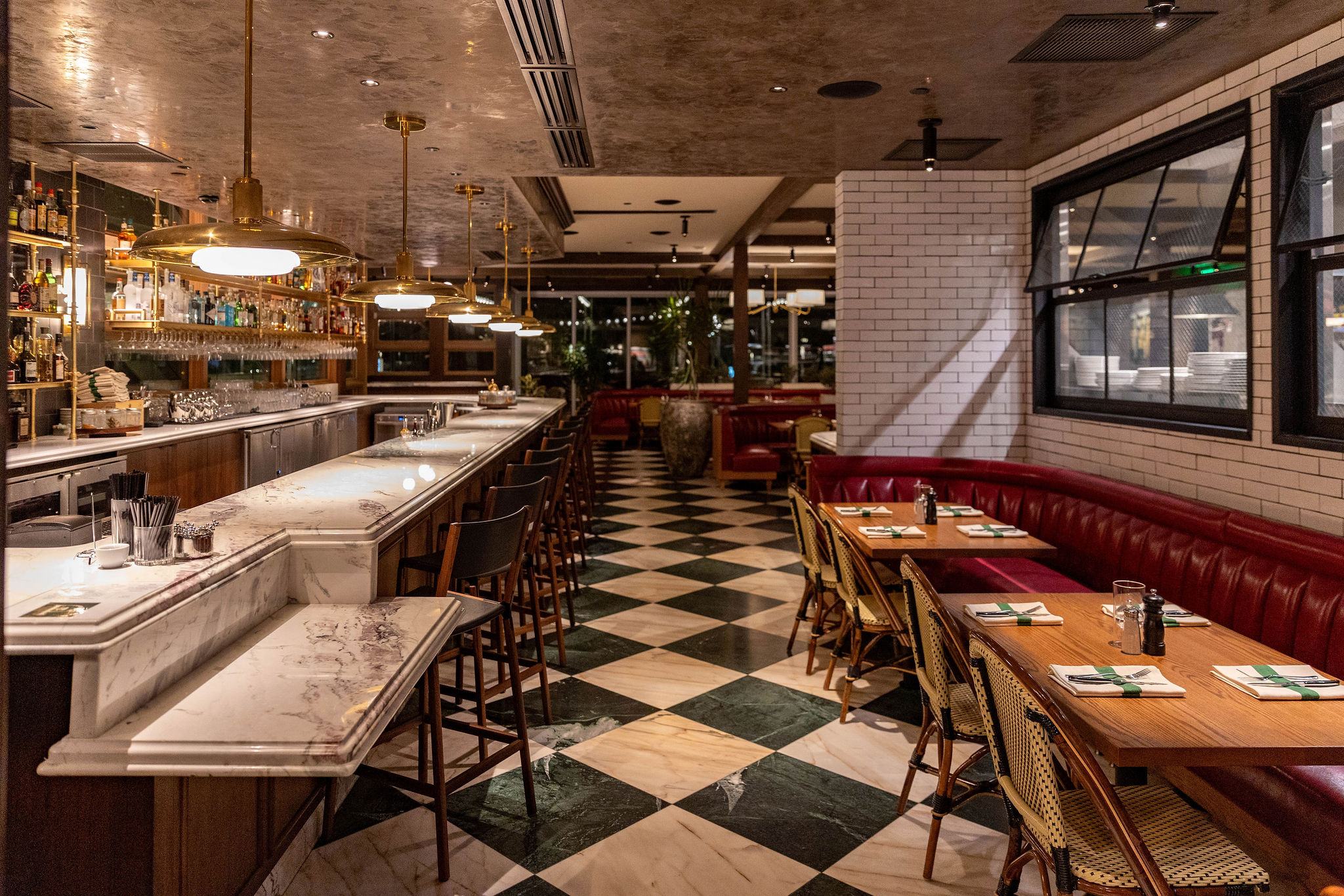 Dual Custom Bars as Design Anchors: The restaurant features two full-service bars, each highlighted by custom brass shelving and bespoke detailing. These bars serve as focal points within the space, combining durability with a refined, high-end presentation that supports high-volume service.